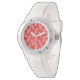 Reloj de pulsera en formas de pulsera rosa reflectante sobre un color base de rojo.