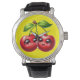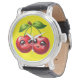 Dos cerezas con tallo juntas. Cada cereza tiene grandes ojos negros y una boca sonriente roja dibujada con un marcador, haciéndolos parecer personajes de dibujos animados.