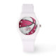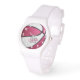 Este reloj deportivo personalizado de baloncesto presenta la imagen realista de un baloncesto que ha coloreado paneles alternados de color rosa y blanco, sobre los cuales se puede personalizar fácilmente el nombre del atleta con un tipo de letra con estilo de firma (o autógrafo) encima del número de camiseta del jugador (con un tipo de letra de letra de letra varsity), y números de la cara del reloj blanco - por katz_d_zynes