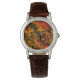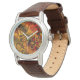 Reloj de correa de cuero marrón para mujeres con una imagen de un fractal de chocolate desembocador derretido. Las órbitas de cristal rojo opcionales marcan las posiciones 12, 3, 6 y 9.Vea toda la colección Fractal Art Watch en la sección ACCESORIOS.