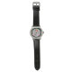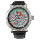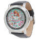 A charming winter scene featuring a snowman wearing a blue hat and scarf, standing next to a snow-covered evergreen tree. Large snowflakes and holly berries are scattered around, and an ornate blue and white dial with Roman numerals is visible in the background. The words MERRY CHRISTMAS are displayed at the bottom. The artwork is presented on a round, silver-toned item with numerical markings around its edge, capturing a serene holiday atmosphere.