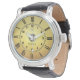 Discover timeless sophistication with this elegant men's watch. Featuring a radiant gold-tone dial adorned with classic Roman numerals and subtle Arabic markers, encased in sleek stainless steel. The genuine black leather strap adds a refined touch, perfect for formal occasions, business attire, or elevating everyday wear. it blends traditional charm with modern reliability. A distinguished gift for the discerning gentleman.