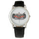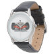Un reloj clásico de correa de cuero negro para hombres se muestra con una foto impresa de un auto de fórmula de carrera. Elija entre varios estilos. Personalizar este reloj o compra como está. Imagen de stock