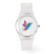Colibrí luminoso, irrisorio, exótico volador sobre fondo blanco, pintado con pintura multicolor, acuarela. Colibrí arcoiris.