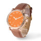 Reloj de Rosa Gold Vintage masculino con correa de cuero marrón, con negrita numerales árabes blancos contra un fondo de neón naranja. Este reloj es personalizable con tu propio texto o imágenes. El color vibrante se asocia a menudo con el signo de Leo Zodiac, lo que lo convierte en una elección de regalo para él.