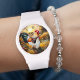 Rise and shine watch featuring a colorful painting of two roosters at sunrise. The numbers are optional.