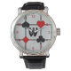 Este reloj personalizado presenta un diseño original inspirado en el Art Déco con un tema de juego de cartas compuesto por símbolos de trajes de tarjetas rojas y negras brillantes (diamante, club, corazón y pala) centrado en el lugar donde se encuentran las líneas horizontales y verticales gruesas y delgadas de la cuadrícula, con un campo de texto personalizado grande para su monograma en el centro.