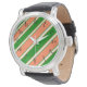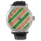 Este reloj con corales y rayas diagonales verdes hace una declaración de moda audaz.