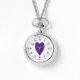Regalo de Reloj de collar. Con un corazón de amor morado y números de reloj en un fondo blanco.