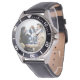 Celebrate a birthday, wedding, anniversary, or other special day with this custom sports jersey inspired stainless steel watch. The name and number sits centered in outline text on a solid background (the blue and white can be changed to the colors of your choice). This watch is ideal for sports fans.