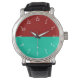 Este hermoso reloj presenta números blancos clásicos sobre un fondo de color rojo y agua. ¿Quién dice que la elegancia tiene que ser aburrida?