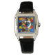 Perfecto reloj de pulsera cuadrado de correa de cuero negro para mujeres con una imagen de vidrio manchado de la deidad Kokopelli. Kokopelli es una deidad de la fertilidad, normalmente representada como un flautista jorobado (a menudo con plumas o protrusiones de antena en la cabeza), que ha sido venerado por algunas culturas nativas estadounidenses en el suroeste de Estados Unidos. Como la mayoría de las deidades de fertilidad, Kokopelli preside tanto el parto como la agricultura. También es un dios timador y representa el espíritu de la música. Vea botón de coincidencia, encanto, gran cadena de teclas cuadrada premium, cadena de teclas acrílicas cuadradas y collar. Vea toda la colección Arizona Watch en la sección ACCESORIOS.