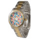 Este reloj masculino tiene un diseño geométrico de cuadrados en mandarina, amapola, coral y tonos verde azulados dispersos por todo el mundo con sus contornos.
