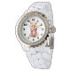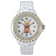 A watch with an illustration of a reddish orange fox pup. A subtle smile on his face. Wearing a nice red scarf for warmth.