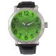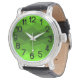 Este reloj masculino tiene un diseño geométrico de cinco tonalidades de verde corriendo horizontalmente.