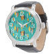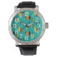 Este reloj masculino tiene un moderno diseño atómico de diamantes de mediados de siglo, y estallidos en un campo de turquesa.