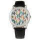 Este reloj masculino tiene un diseño moderno de mediados de siglo de diamantes en naranja, amarillo, turquesa, gris y delineado por todos lados en un campo de blanco.