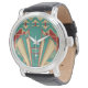 Diseño Art Deco angular vintage en rojo oscuro y turquesa.