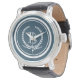 Diseño monograma con decoración de plumas laurel en forma redondeada a rayas sobre fondo azul