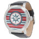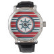 Diseño náutico con decoración de ruedas de vela en forma redonda sobre fondo rayado rojo, azul y blanco