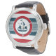 Diseño náutico con decoración de velero en forma redonda sobre fondo rayado azul, rojo y blanco