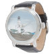 Este dibujo cuenta con un faro blanco, verde y negro con vistas al mar. El cielo es azul con algunas nubes. Casas blancas con tejados verdes rodean el faro. Este diseño está disponible en relojes para mujeres, hombres y niños.