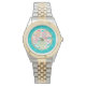 Este elegante reloj de pulsera para ella presenta purpurinas falsos, conchas coloridas en múltiples colores de verde azulado, rosa coral, agua y oro. Las conchas se colocan sobre rayas de chevron azul acuático que también contienen imágenes del patrón de la concha, y se contrastan con rayas de chevron blancas. Los fabricantes de diamantes blancos en una banda de verde azulados que hacen el reloj fácil de leer. Un marco de círculo dorado separa el patrón de la banda azul verde azulada. ¡bonito!