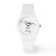 Este reloj presenta un gráfico vectorial de una jeringa con líquido azul, y el texto del personalizable, "Enfermera *tu nombre*". El color de fondo se puede personalizar si se desea.