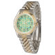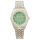 Este reloj femenino tiene un diseño moderno de mediados de siglo de rectángulos redondeados con ovales en el interior en colores retro de turquesa, verde azulado, blanco roto y oro. Si quieres el mismo diseño con colores diferentes, envíame un mensaje.