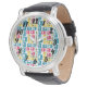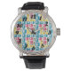 Este reloj masculino tiene un diseño moderno de mediados de siglo de rectángulos redondeados, algunos de los cuales están unidos y algunos tienen estrenos, en colores retro de rojo, oro, verde y turquesa. Si te gusta el diseño pero prefieres colores diferentes, envíame un mensaje.