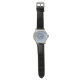 Elegante reloj con símbolo de escalas de justicia con fondo azul.