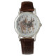 Un reloj de cuero de bonito con una fotografía al aire libre que muestra a un equipo de dos caballos de compañía belgas jalando un trineo. Copos de nieve cayendo suavemente con pinos cubiertos de nieve en el fondo. Cara de reloj Art Déco.