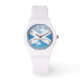 Un diseño divertido con la bandera de St Andrews en un Cabochon de cristal enmarcado con una banda de tono plateado, imagen que será realzada por el frente del reloj para personalizar con un nombre o texto sobre un fondo rojo o un color de su elección.