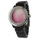 Un elegante reloj de pulsera con una imagen que evoca un confetti rosa brillante flotando en el aire.