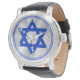 Reloj de correa de cuero negro vintage para hombres con una imagen de una estrella azul real de David y doble borde azul real sobre una plata brillante. Cara de reloj plateado opcional. Vea botón cuadrado coincidente, botón redondo, encanto redondo, gran cadena de teclas metalizado premium redondeada y collar redondo. Vea toda la colección Hanukkah Watch bajo la categoría ACCESORIOS en la sección VACACIONES.
