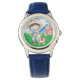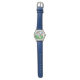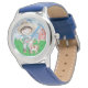 Eine Armbanduhr für Kinder mit blauen Band und Bauernhof-Design. Ein Junge steht auf der Wiese mit Kälbchen.