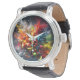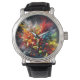 Una vibrante explosión de frutas frescas, incluyendo manzanas, fresas, plátanos y bayas, arregladas artísticamente en un dinámico patrón giratorio. Brillantes salpicaduras de colores (rojos, amarillos, verdes y azules) se entrelazan con los frutos, creando una composición dinámica y animada. El fondo es oscuro para realzar la vitalidad de los colores y el frescor de las frutas, que evocan una sensación de vitalidad y abundancia.