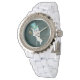 Este reloj de pulsera tiene un fantasma blanco fantasmagórico flotando en un cielo estrellado de noche usando un sombrero azul y sosteniendo un bastón negro recortado en oro con un cráneo de oro encima.