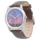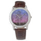 Una pintura acuarela ACEO de una vieja fila de vallas y árboles otoñales colocados contra el rosa y el azul más profundo de la noche, cielo crepúsculo.