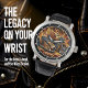 This close-up image showcases a distinctive watch face with a bold, fiery illustration. A vintage-style motorcycle with a sidecar, both adorned with vibrant orange and yellow flames, dominates the center. Large, feathered wings extend from the motorcycle's back. The dark background highlights the fiery design, creating a dynamic and striking timepiece.