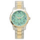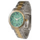 Este reloj de hombres tiene un diseño moderno de mediados de siglo de flechas en dos tonos azules en un campo de verde marino.