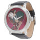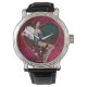 ¡Un divertido reloj artístico de muñeca chica! Este reloj muestra a un chica bobo golpeando una posición sobre un taburete, con alas, su arco y flechas, frente a un fondo rojo de corazón artístico. La banda destacada es una banda de cuero negro que complementa esta obra de arte. Opción para seleccionar un estilo diferente de bandas en el menú desplegable de esta página. Este es un gran reloj para añadir a tu estilo diario, o como regalo para la familia o amigos también