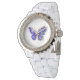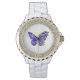 Joyería, azul, zafiro, mariposa floral brillante con ala decorada con flores azules y preciosas con hojas de oro sobre fondo blanco.