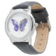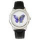 Joyería, azul, zafiro, mariposa floral brillante con ala decorada con flores azules y preciosas con hojas de oro sobre fondo blanco.