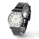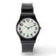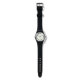 Este reloj de mujeres tiene un diseño moderno de mediados de siglo de círculos y partes de círculos hechos para parecer flores con tallos hechos por líneas continuas, repitiéndose a lo largo del diseño.