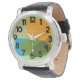 Este reloj masculino tiene un diseño moderno de mediados de siglo de un rectángulo, un oval, y un paralelograma con círculo vacío y líneas paralelas que se superponen. ¿Quieres colores diferentes? Mándame un mensaje.