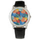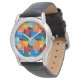 Este reloj masculino tiene un diseño Bauhaus de formas aleatorias en azul, verde azulado, amarillo, rojo y naranja.