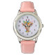 Un reloj de pulsera con un caprichoso ilustracion acuático en el que se ve la cara de una jirafa con una corona floral de primavera bonito. Colorido y lindo.