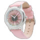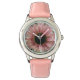 Este impresionante reloj muestra una hermosa fotografía de un girasol rosa pálido. El girasol es de color rosa natural y los pétalos tienen un anillo exterior rosa pálido y un anillo interior rosado más oscuro. El medio donde están las semillas es negro. Esta fotografía fue tomada en un jardín.