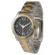 Este reloj masculino tiene un diseño art deco de círculos blancos conectados con líneas en un campo de negro.